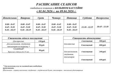 УВАЖАЕМЫЕ ПОСЕТИТЕЛИ ПЛАВАТЕЛЬНОГО БАССЕЙНА «ВОЛНА» С 10.04.2026 расписание сеансов свободного плавания будет изменено. Тренажерный зал работает в прежнем режиме. |