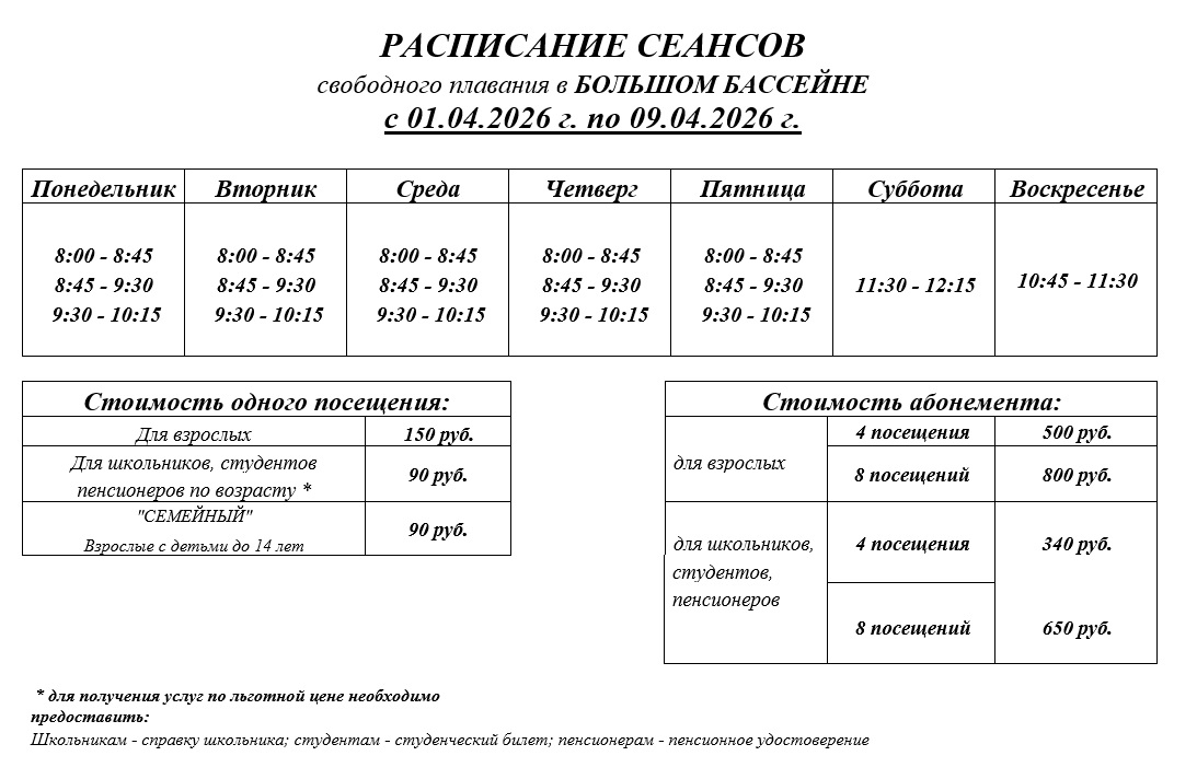 УВАЖАЕМЫЕ ПОСЕТИТЕЛИ ПЛАВАТЕЛЬНОГО БАССЕЙНА «ВОЛНА» С 10.04.2026 расписание сеансов свободного плавания будет изменено. Тренажерный зал работает в прежнем режиме. |