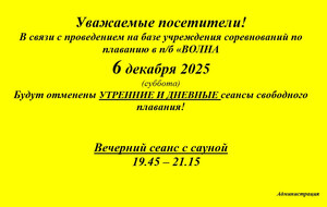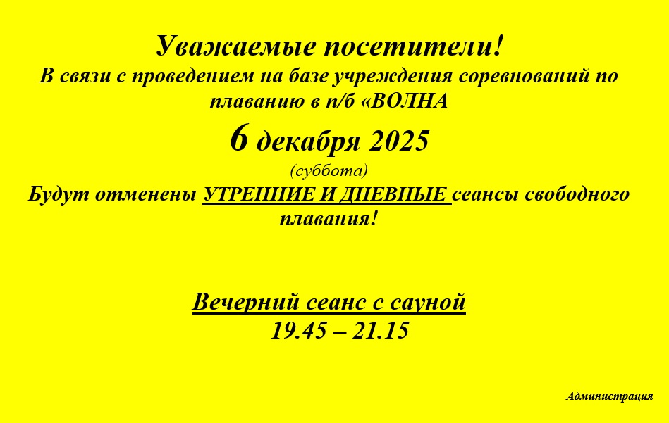 В связи с проведением на базе учреждения соревнований по плаванию 06 ДЕКАБРЯ 2025 года ОТМЕНЕНЫ УТРЕННИЕ И ДНЕВНЫЕ СЕАНСЫ свободного плавания.